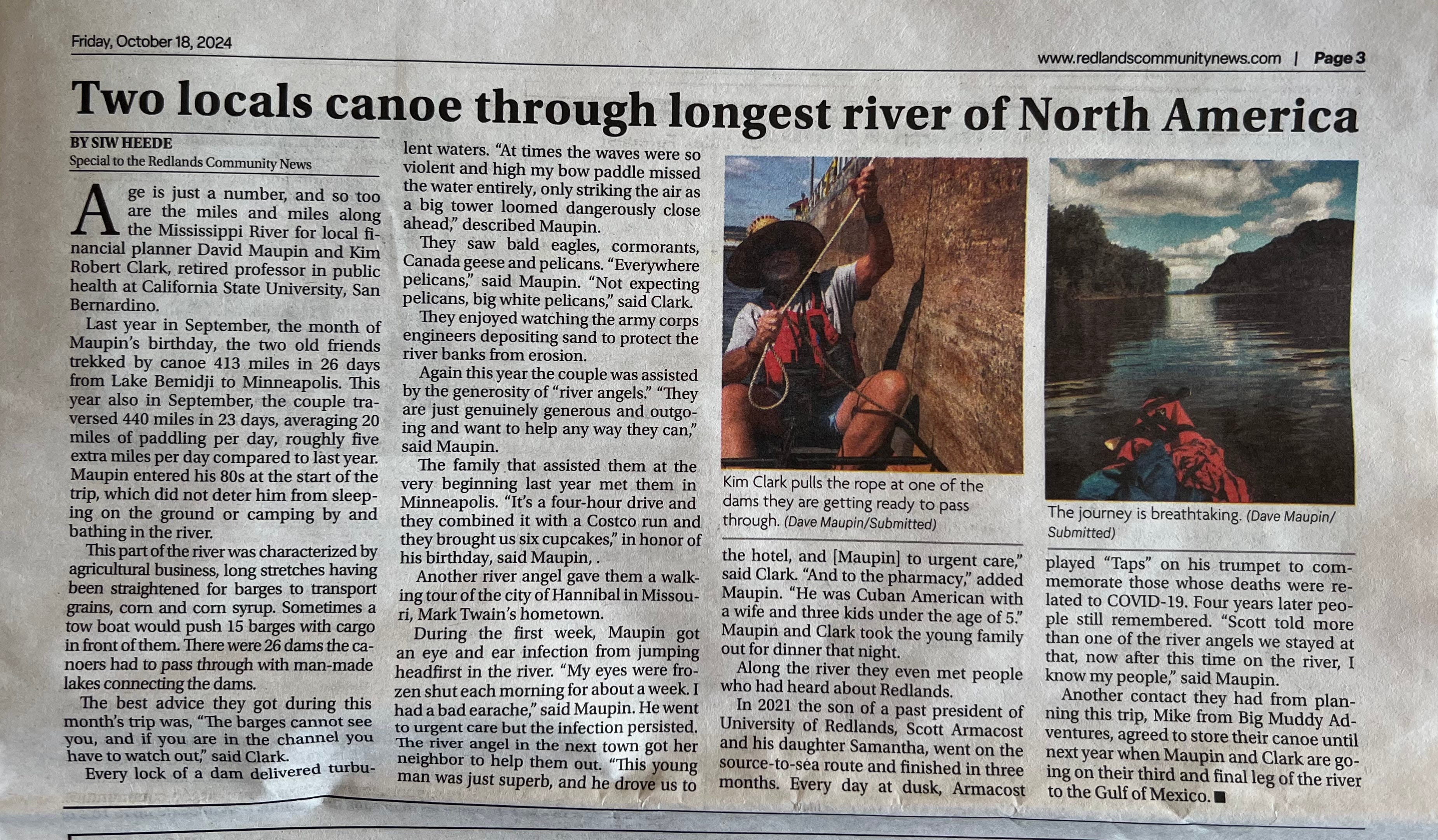 Age is just a number, so too are the miles and miles along the Mississippi River for David Maupin and Kim Robert Clark, local financial planner and retired professor in public health at Cal State University respectively. These two Redlands friends have known each other for decades, they both used to go backpack hiking. The outdoors feel like a well worn shirt to them, comfortable and necessary.
